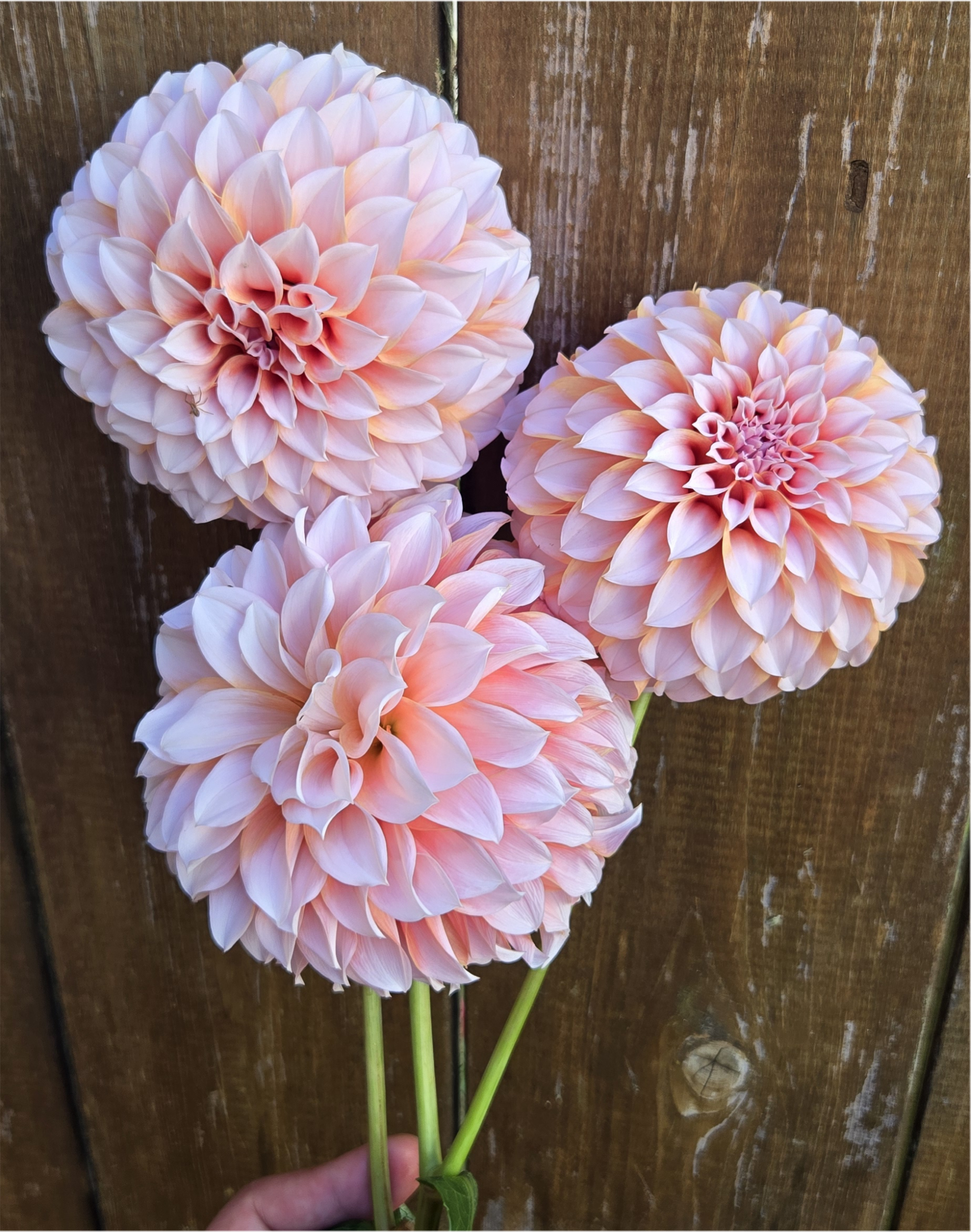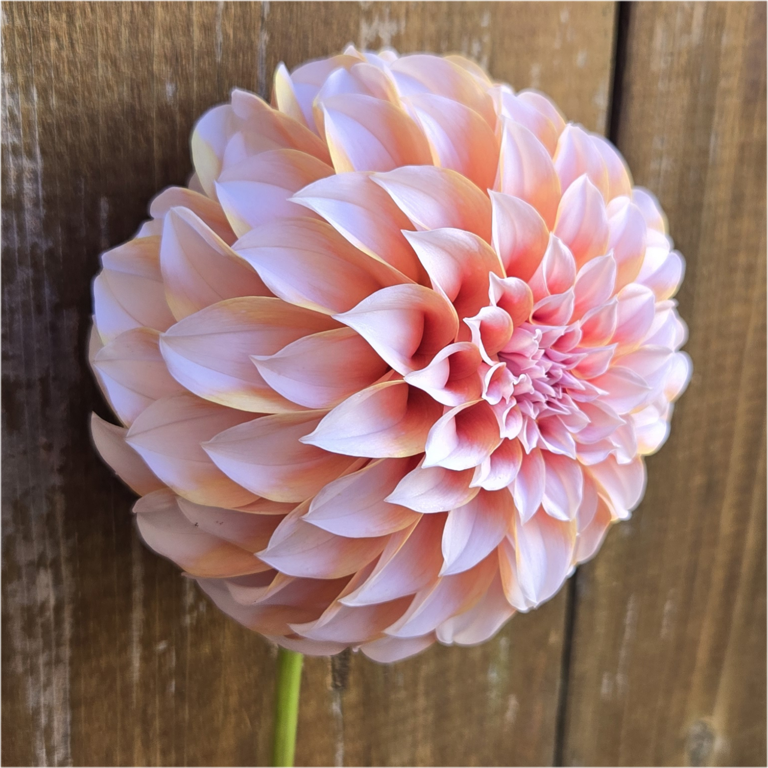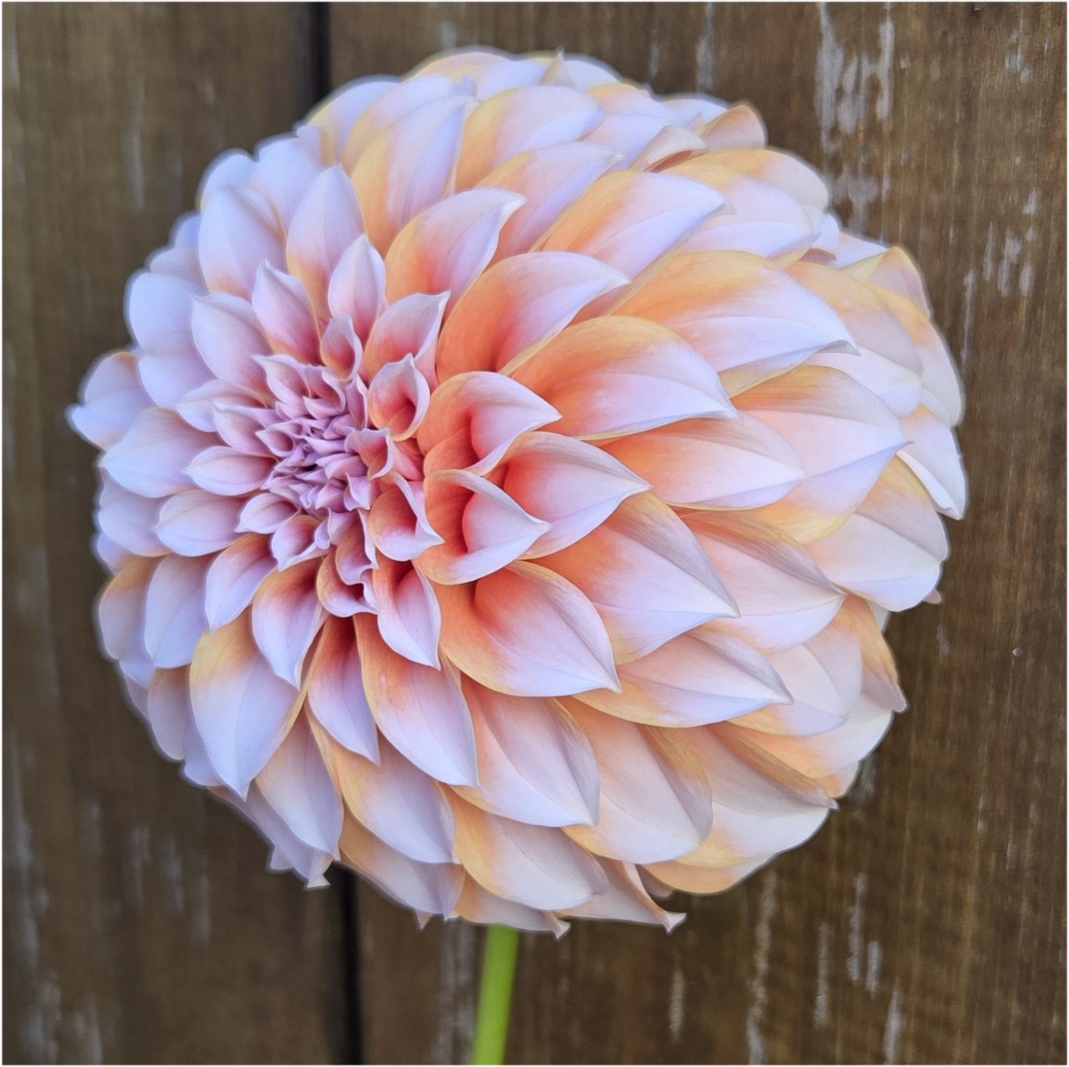 Color: The color is a "peachy orange with white tips" or "soft salmon petals that fade to white at the tips." This distinct, sharp separation of two colors—peach/salmon (OR) and white (W)—is the definition of a Bicolor (BI) dahlia.
